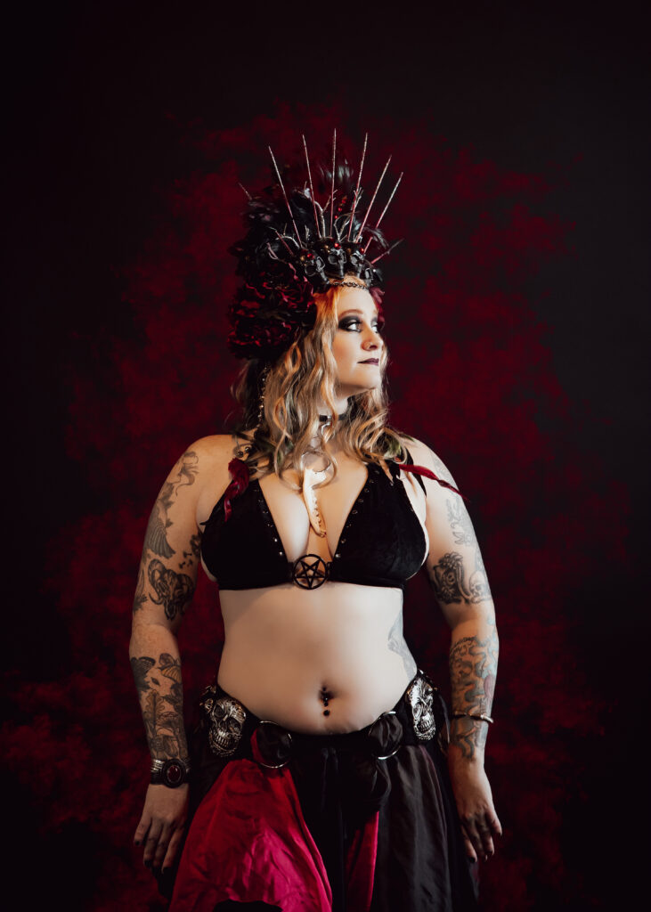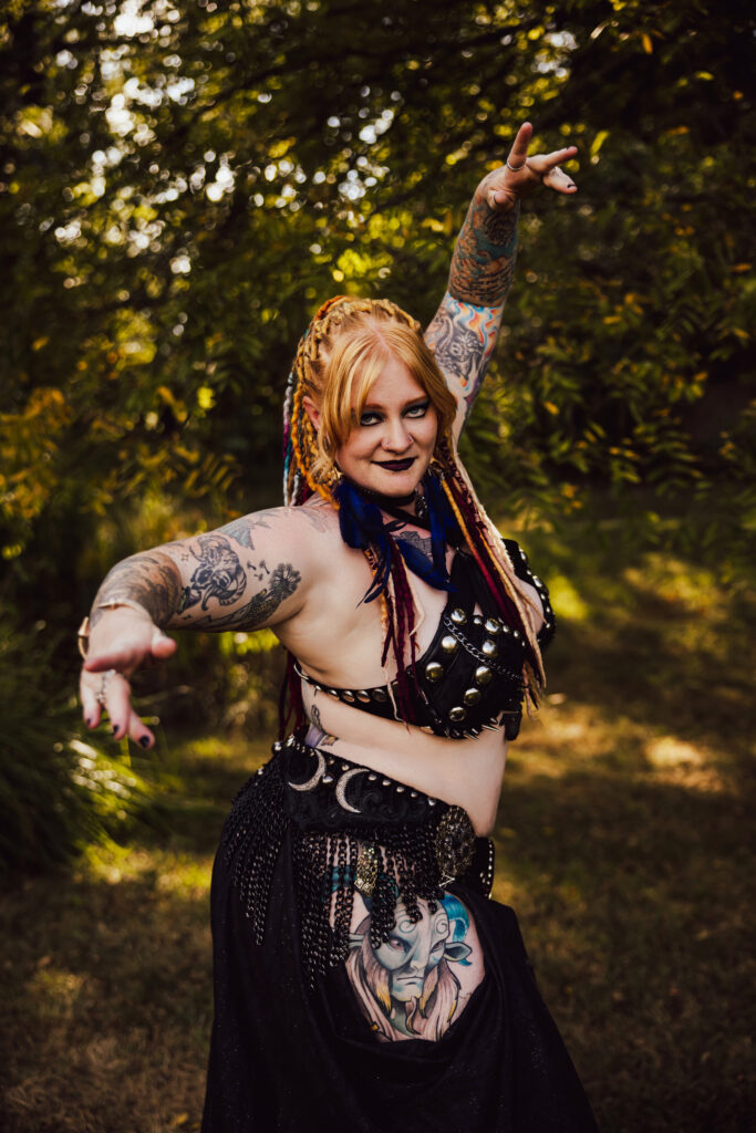 I started belly dance in 2012 after having surgery, and fell in love after one class. Quickly after, I started experimenting with fusing belly dance with the music that’s always moved me – metal. After finding more dancers that shared my fascination, I began teaching and performing locally… and now I do so worldwide, online and at festivals like Gothla Australia, Stone Soup in KC, Gothla Atlanta, Bayou Belly Festival in NOLA, and many more to come!